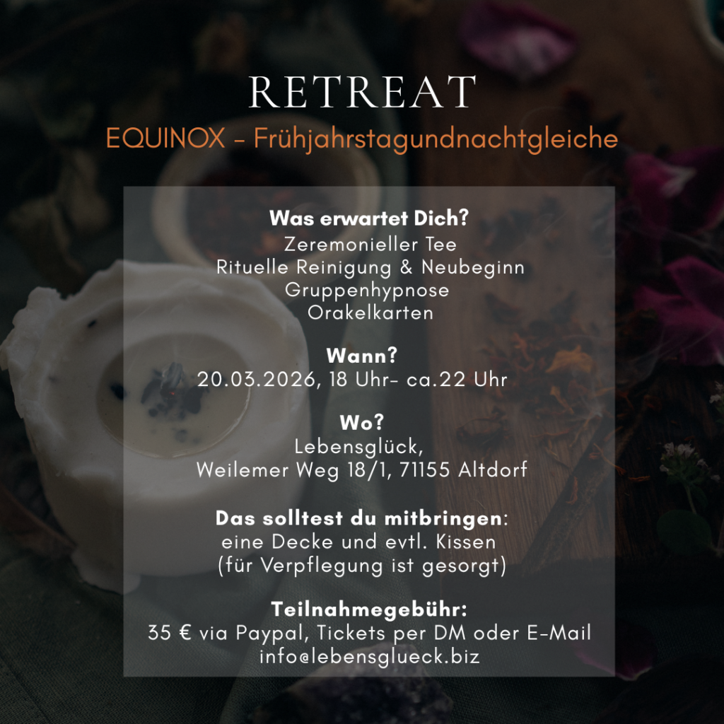unser Retreat – für Alle die sich reinigen, einen Neubeginn und wieder in Ihre Mitte kommen wollen. Anmeldung erfolgt über eine Privatnachricht oder eine Mail an info@lebensglueck.biz – Tickets sind begrenzt! – Wir freuen uns auf dich